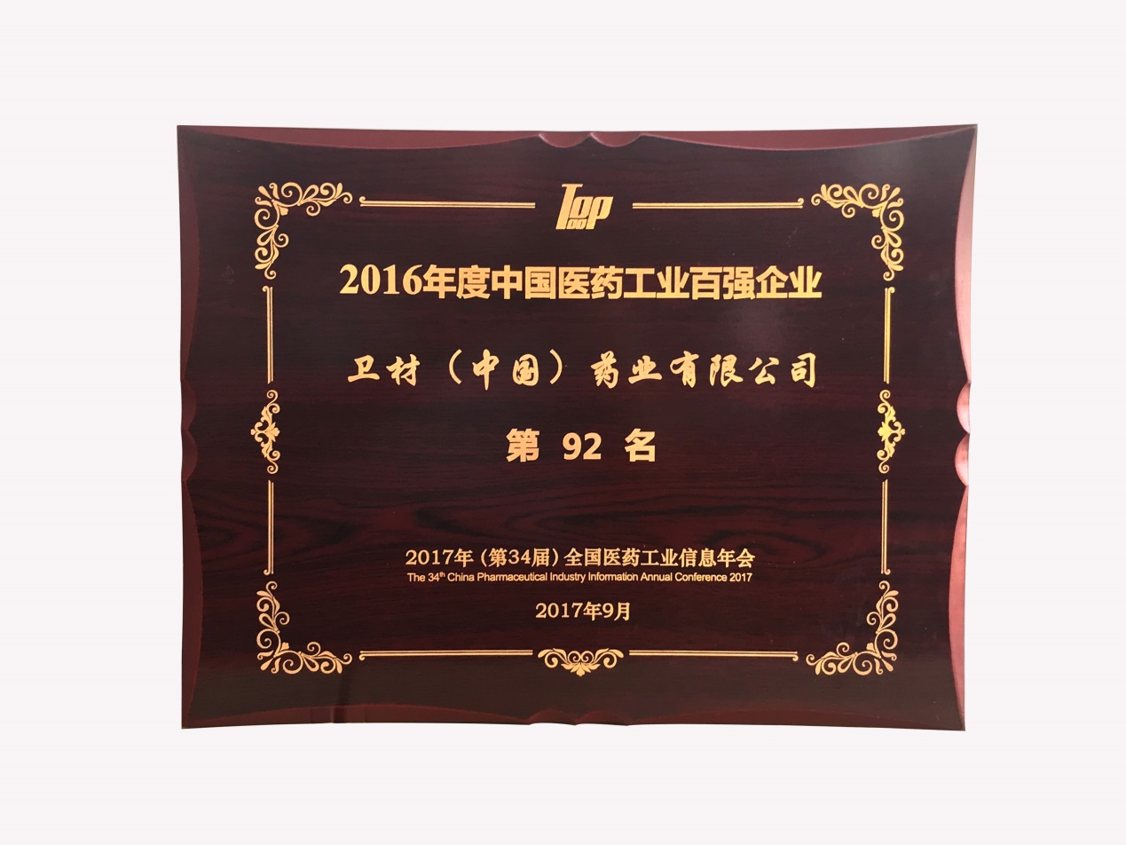 2017年9月2日,继2014年度排名第101位和2015年度排名第97位后,卫材(中国)药业有限公司荣登工信部2016年度中国医药工业百强企业榜单,排名第92位。卫材(中国)药业有限公司政策管理高级部长张杰逵先生代表卫材(中国)上台领奖。