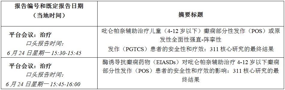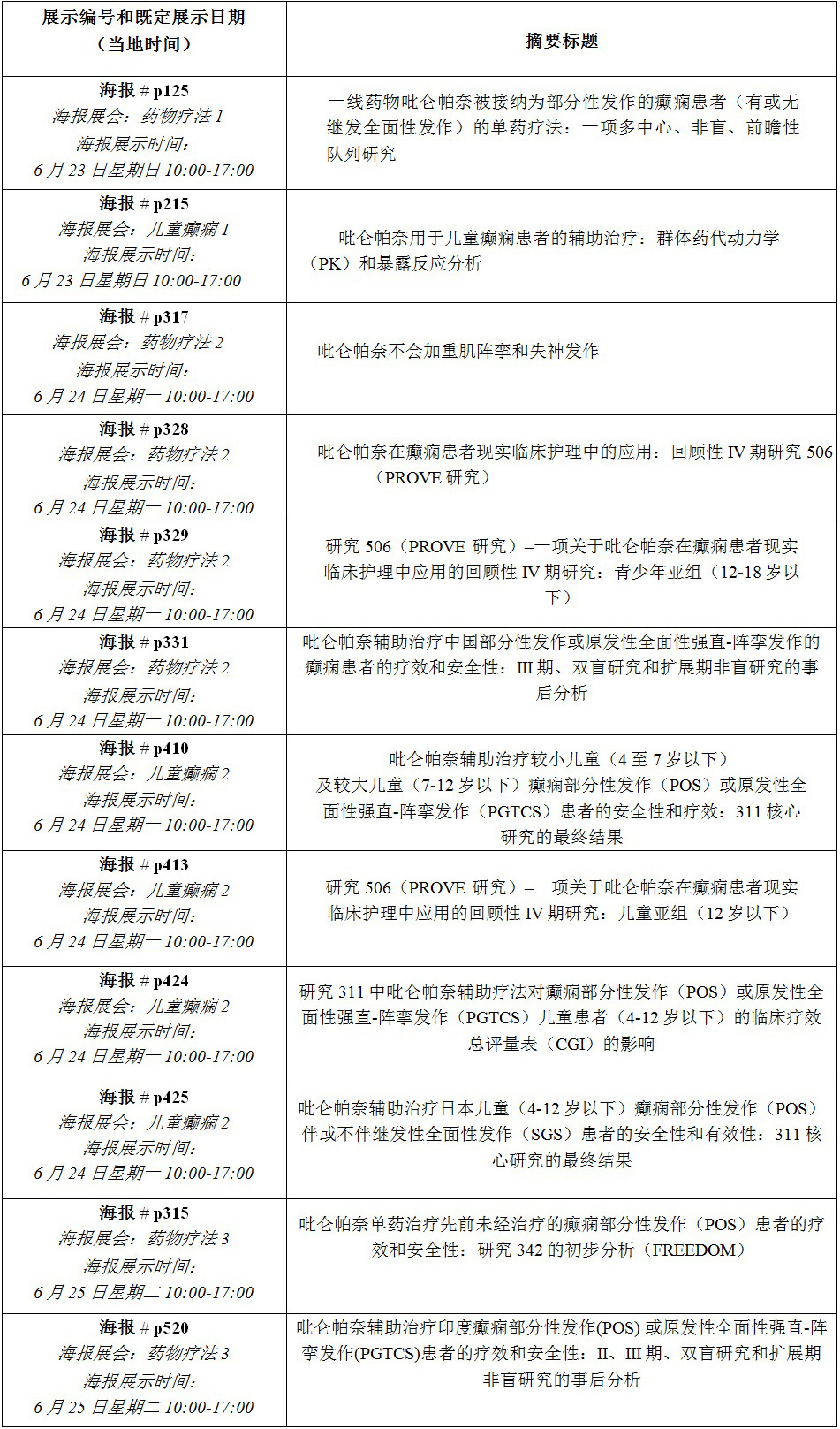 届时,卫材将在主报告阶段进行两次口头报告,内容包括针对4至12岁以下儿童癫痫患者的,联合吡仑帕奈进行治疗的III期临床研究(研究311)的最终分析结果。此外,在日本及韩国,针对未经治疗的部分发作性癫痫患者(有或无继发性全面性癫痫发作),探讨关于吡仑帕奈单药治疗的疗效和安全性的III期临床研究(FREEDOM/研究342)的初步分析,也将通过12份海报进行展示。
