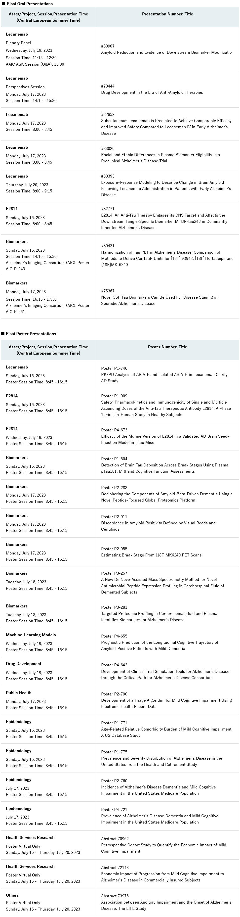 EISAI TO PRESENT THE LATEST ALZHEIMER’S DISEASE PIPELINE AND RESEARCH, INCLUDING LECANEMAB AND ANTI-MTBR TAU ANTIBODY E2814, AT THE ALZHEIMER’S ASSOCIATION INTERNATIONAL CONFERENCE (AAIC) 2023